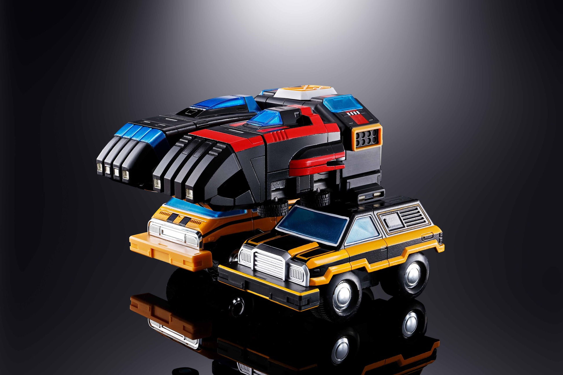 Fifteen vehicles combine to form a massive robot! A long-awaited Soul of Chogokin edition of the globally popular super robot, it faithfully forms into the three Air, Land, and Sea Team combat modes as well as the towering Dairugger XV! SORRY, NO DISCOUNTS MAY BE APPLIED TO PRE-ORDERS.