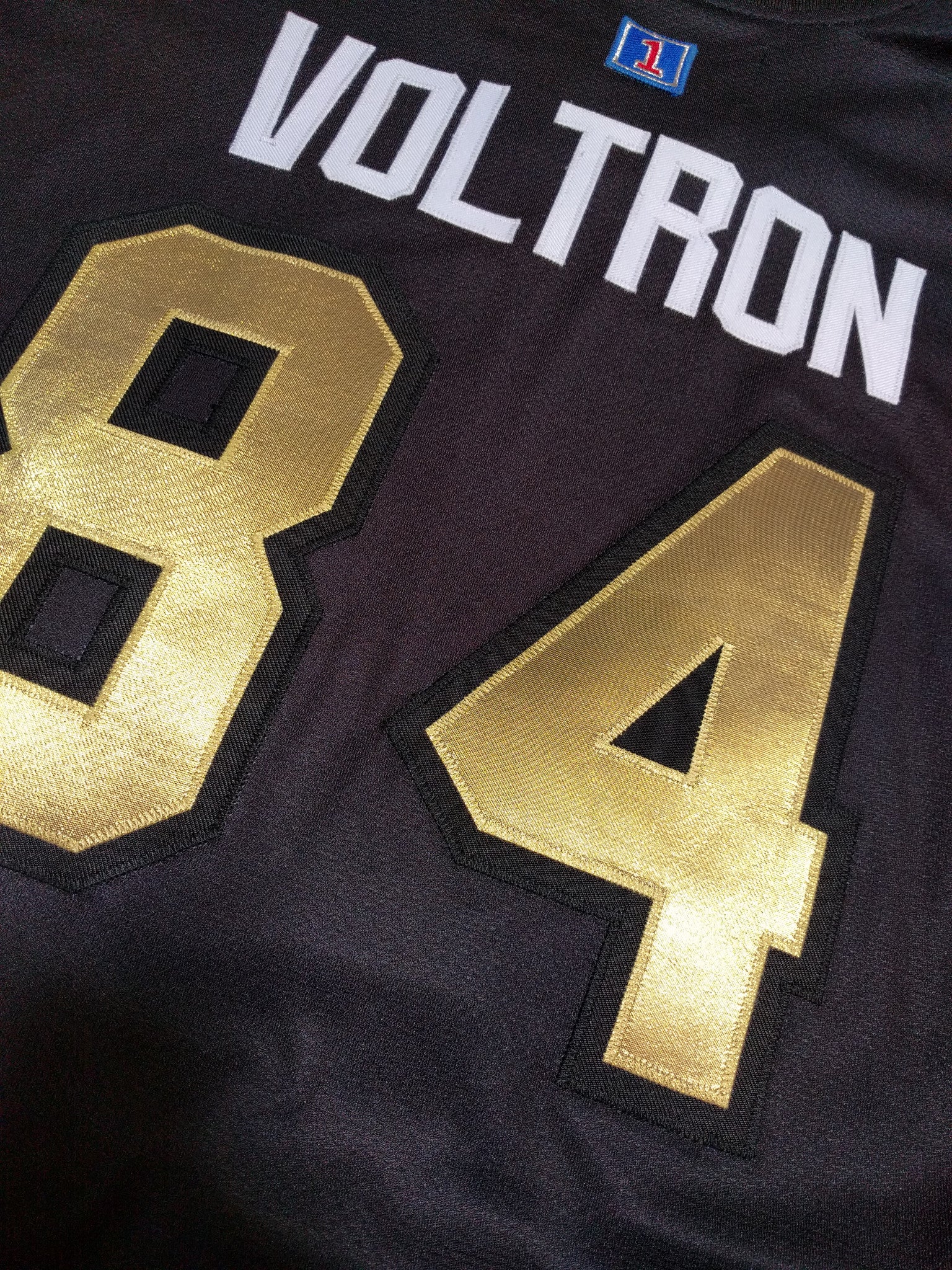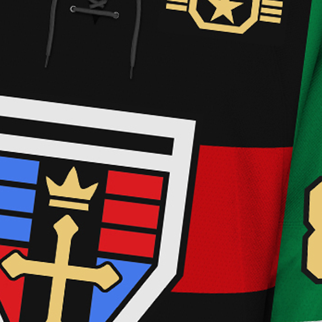 The second officially-licensed Voltron hockey jersey features a new front shield, gold numbers, and thinner stripes. A white lace-up collar has also been added. The design is based off of the 30th Anniversary toy.